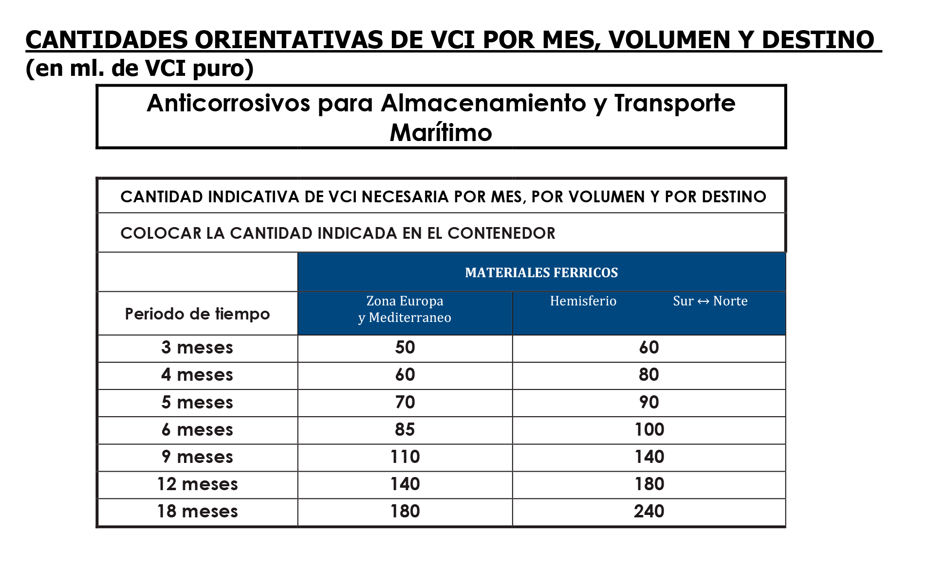 Debe colocarse el material a proteger y ANTICORROSIVO VCI TAB 75 TFe en un envase lo más hermético posible, por ejemplo caja de cartón, contenedor, tela impermeable, etc., para limitar el aire a saturar y evitar su arrastre. Las cajas de madera, forradas interiormente con papel bituminoso para tapar juntas, son también adecuadas. Las cantidades a emplear de ANTICORROSIVO VCI TAB 75 TFe son variables, dependiendo del volumen de aire contenido en el interior del embalaje, de la cantidad de agua prevista y teórica, que pueda existir en el interior del embalaje y de las dimensiones de la superficie a proteger. La dosis normal es de 1 a 2 unidades de ANTICORROSIVO VCI TAB 75 TFe por cada 0,5 a 1 m³ a proteger, siempre y cuando la cantidad prevista de agua total en el interior del embalaje no supere los 7 ml. por unidad utilizada.