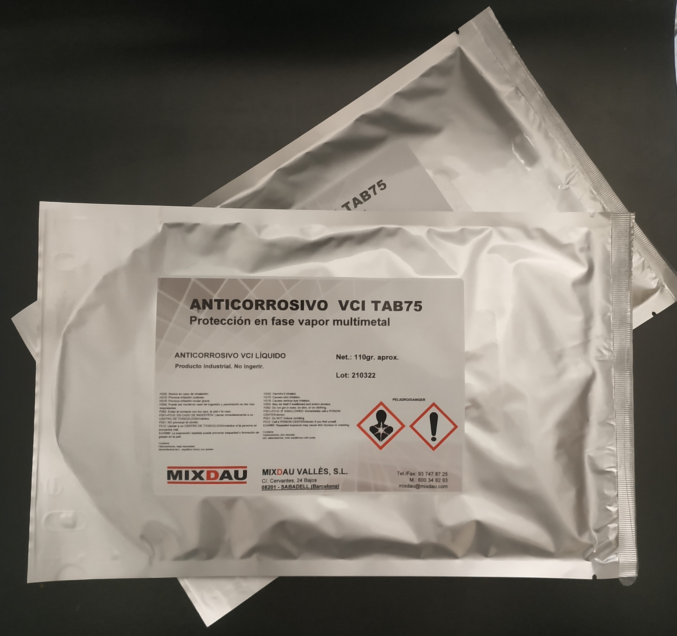 Las piezas protegidas con ANTICORROSIVO VCI TAB 75 TFe pueden ser almacenadas durante varios años si se utiliza un embalaje apropiado, que impida la permeabilidad del vapor de agua y se mantenga convenientemente sellado.